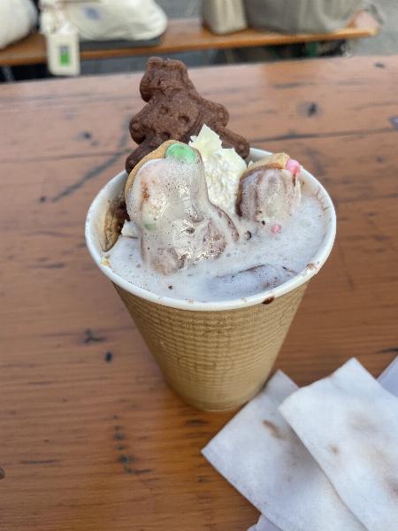 雪だるまとツリーが乗ってるホットチョコレートを