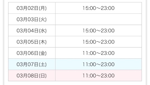 3/4(水曜日)11:00-23:00