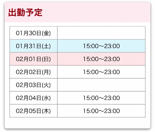| 日 | 月 | 火 | 水 | 木 | 金 | 土 |