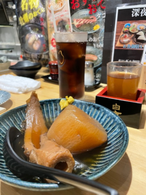 毎度お馴染みの冷たい出汁割り飲みつつ、お出汁しみしみのおでん食べれて幸せです😌💭🎀